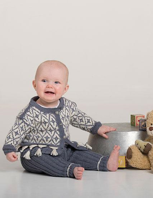Denne gang laget jeg dobbelt opp - til tvillinger som blir født snart. Har også på dette settet brukt Sandnes Mini Alpakka, et godt garn og jobbe med og en nydelig blåfarge. Luen og sokkene er strikket i hvitt, grunnen til det var at jeg hadde påbegynt et annet prosjekt enn disse jakkene. Som dere skjønner ble dette puttet i en pose og lagt bort; ikke fornøyd :( Sokkene er selvkomponert mønster.